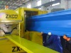 Roll forming machine The products from roll forming machine looks very beautiful and have a high strength, its widely used as the roof of the factory, garden, hotel, exhibition center, etc!Main Technical Specification zx-240(610)1. Size: 9300mmx2270mmx2400mm2. Total Weight: About 12000kg3. Controlling System: PLC4. Forming Power: 7.5kw5. Bending Power: 4.0kw+1.5kw+1.5kw6. Cutting Power: 3.0kw7. Material of rollers: 45#steel, quenched HRC 58-628. Material of roller shafts: 45#steel9. Material of cutting blade: Cr12 steel10. PLC Type: Siemens11. Step of rollers: 13 steps12. Feeding Width: 914mm13. Effective Width: 610mm 14. Thickness of the coil: 0.6-1.6mm15. The depth of the groove: 203mm16. Working speed: Straight sheet: 15m/min17. Arch sheet: 13m/min18. Sewing: 10m/min19. Max span: 38m